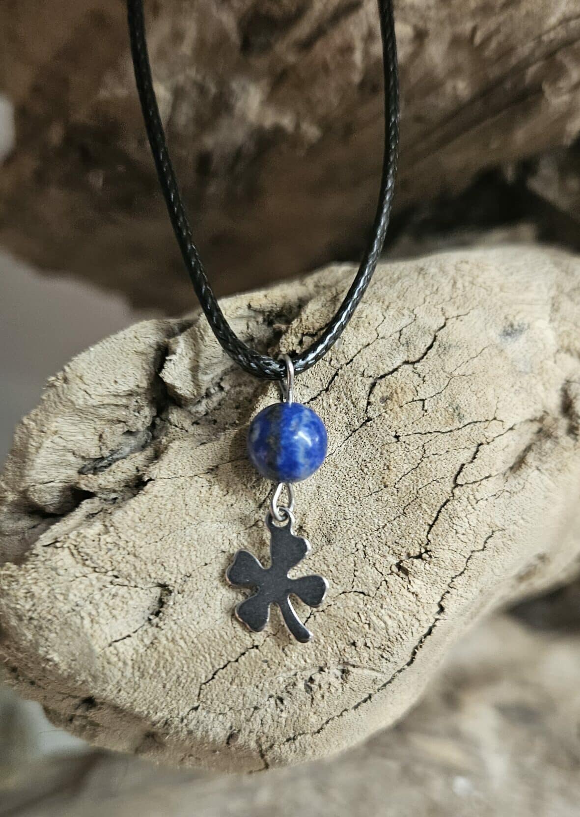 Collier porte bonheur trèfle à 4 feuilles en lapis-lazuli pierre de la méditation et du lâcher prise